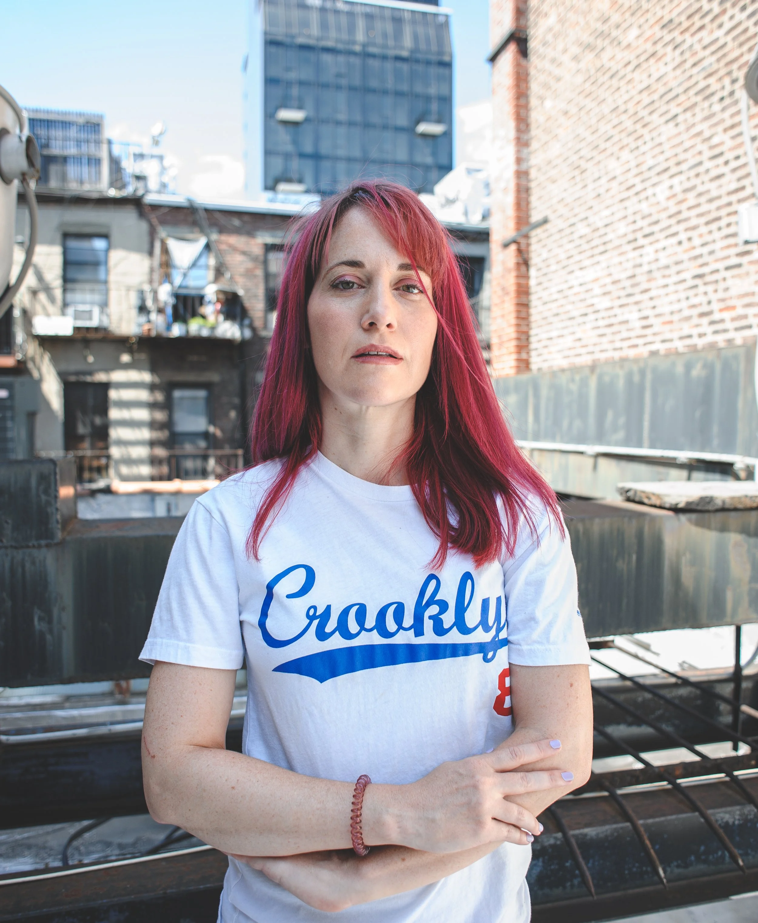 A woman with pink hair wearing a white T-shirt that says 'Crooklyn' stands on a rooftop with a cityscape background.